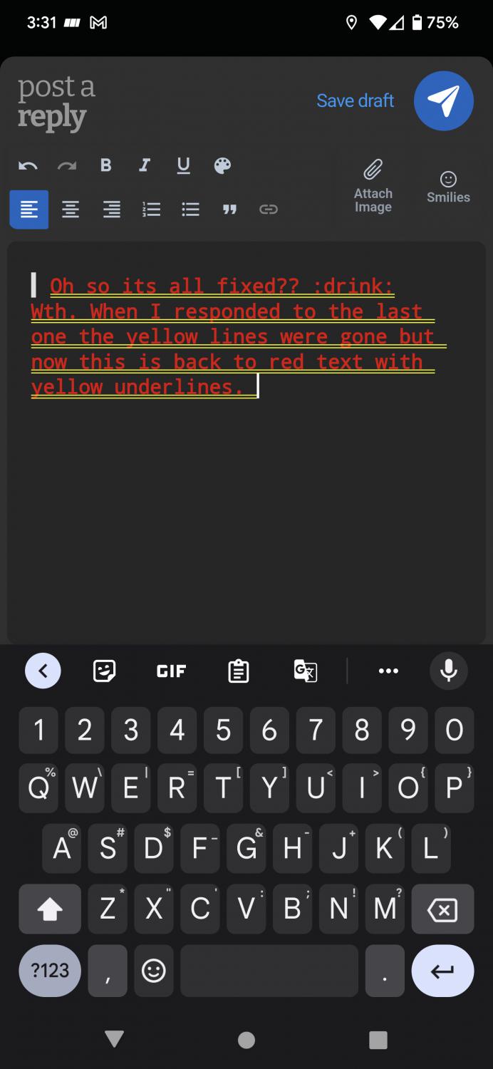 Maybe this is somewhere in the 11 pages of the thread, but the reply window is wonky. All of the text is double red underlined and the keyboard covers the entire area that you are typing in so you can't see anything you are typing, nor can you see what you are deleting, especially if you are trying to delete just a few characters. Makes replying with quoted text challenging.