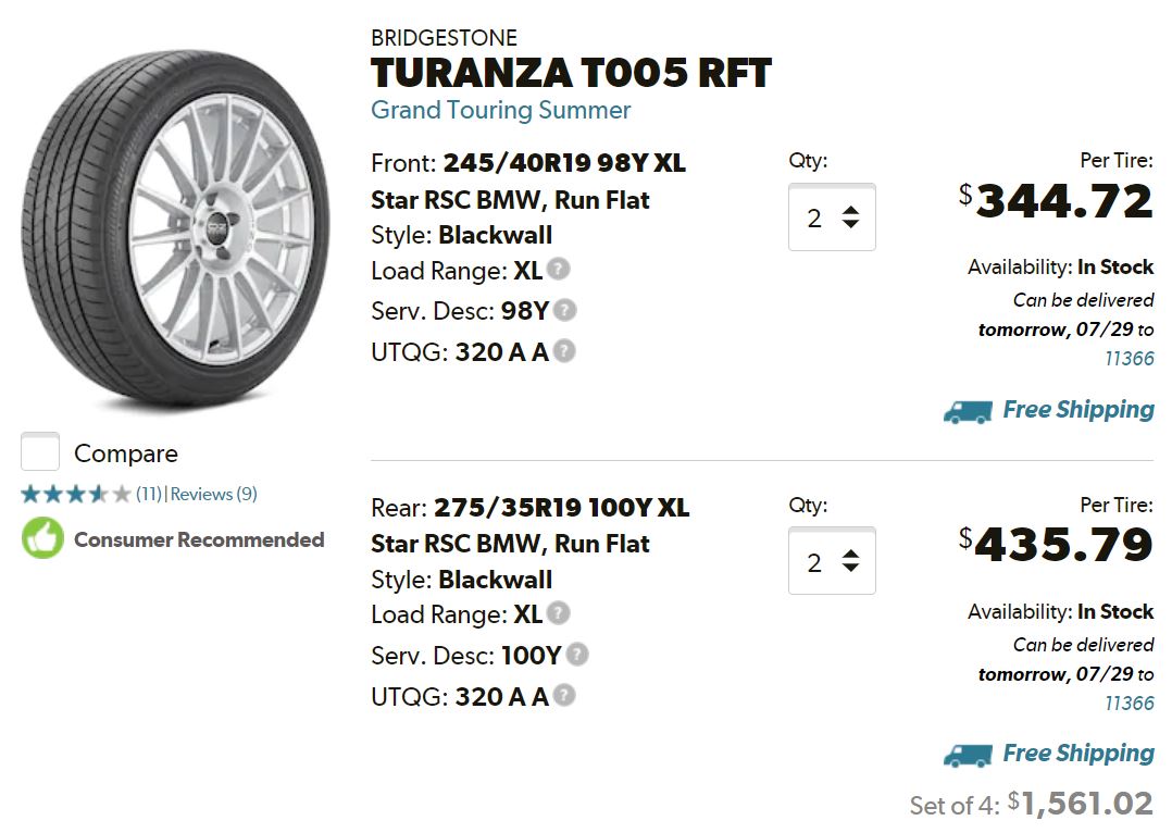 Selling for a friend... 2 x Bridgestone Turanza T005 RFT 245/40/19 2 x Bridgestone Turanza T005 RFT 275/35/19 These are takeoffs with practically no miles on them. Pickup in Queens NYC only. You are welcome to take a look in person. Retail is $1500+ on tirerack. Price is $800.