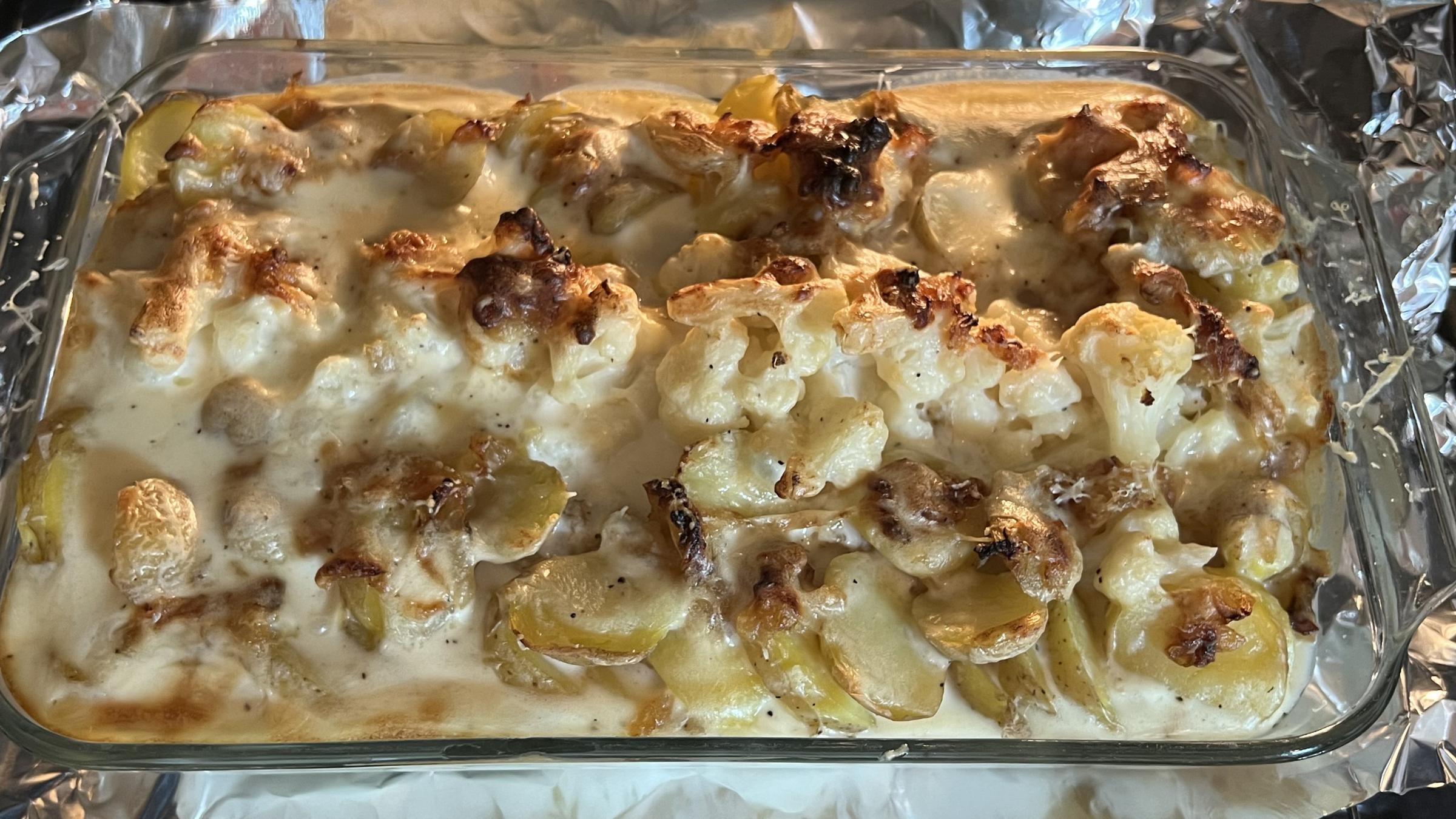 This falls under the “and more” category in the thread title. Potatoes, cauliflower, caramelized onions, bechamel, parmesan and Gruyere. One of my faves! |