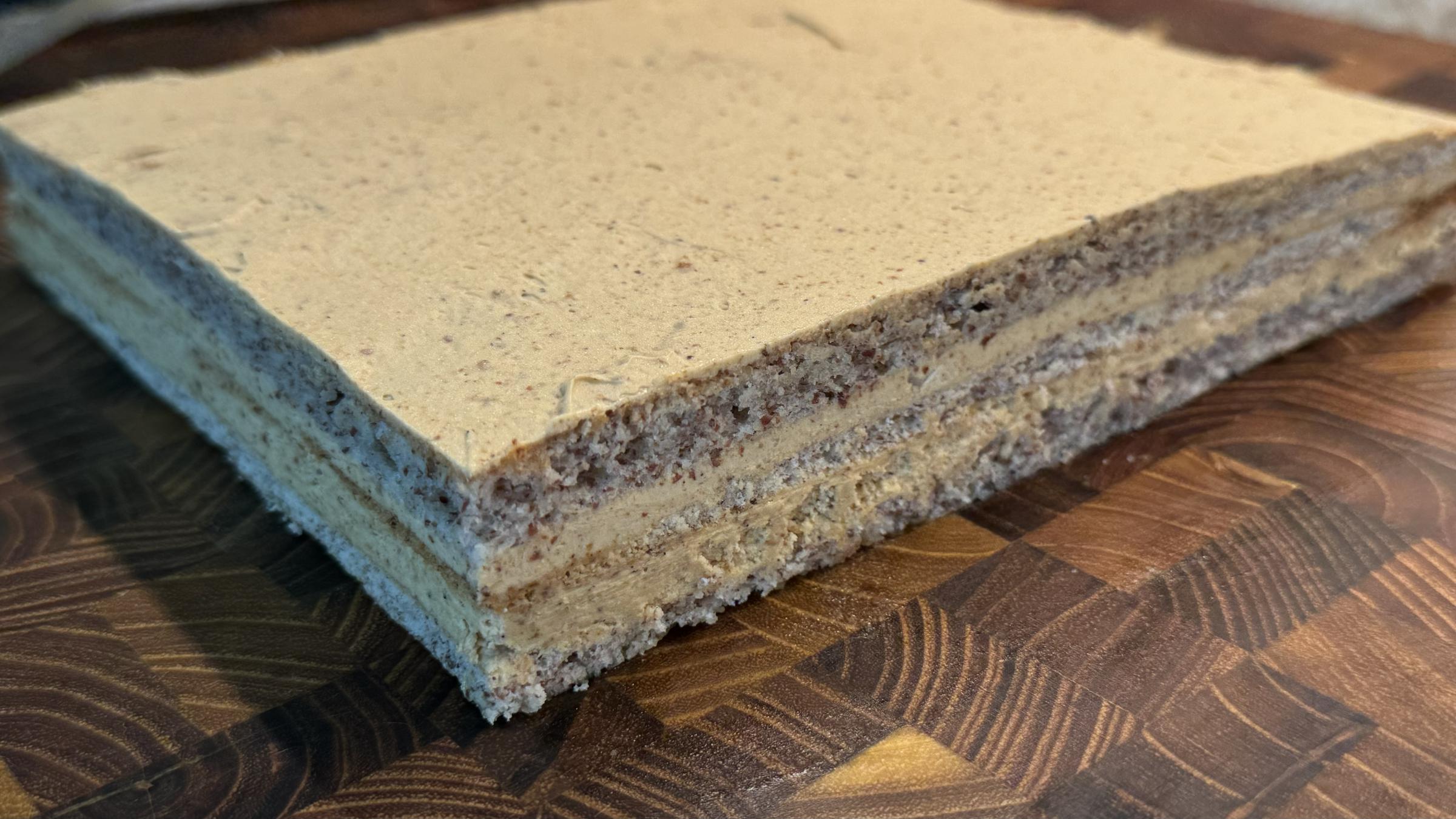 Recipe from Bruno Albouze Three layers of daqcquoise (almond biscuit) filled with hazelnut buttercream. One of my favorite pastries to make, and to eat. The hazelnut buttercream is off the charts with flavor, and the daqcuoise has a nice almond flavor and texture. I have posted this on this site before. The build is pretty intensive: 12 separated eggs 2 batches whipped egg whites 2 batches cooked sugar baking a thin, easily burned and difficult to handle pastry assembly freeze overnight demold cut into portions I left out a bunch of steps! After assembly and when I put it into the freezer, it slid off the freezer shelf and almost splatted on the floor, but I was able to catch it! ![]() Last edited by chassis; 05-25-2024 at 06:23 PM.. |