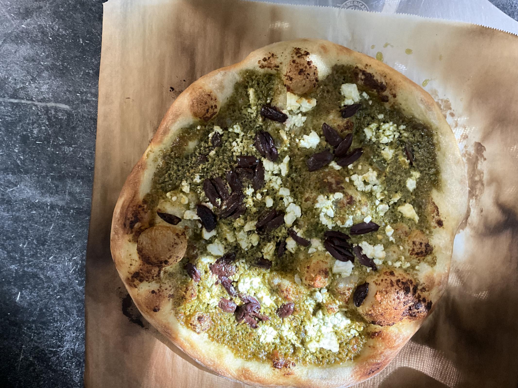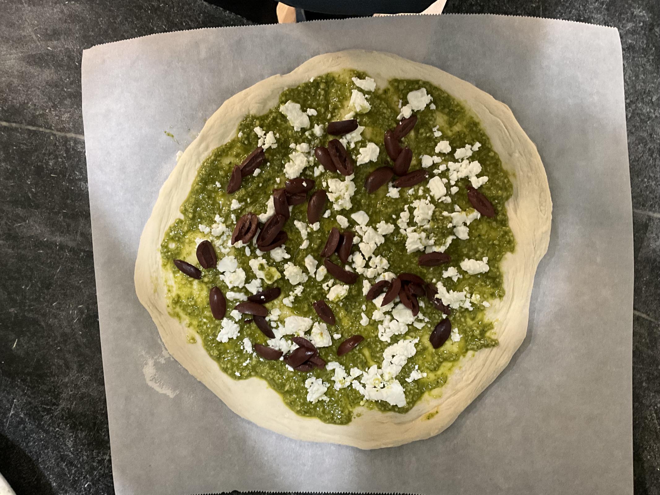 Let the dough proof overnight. Pesto, feta, and Kalamata olives