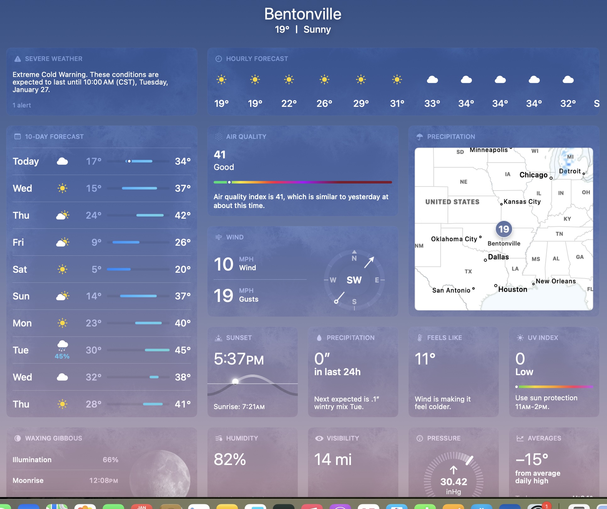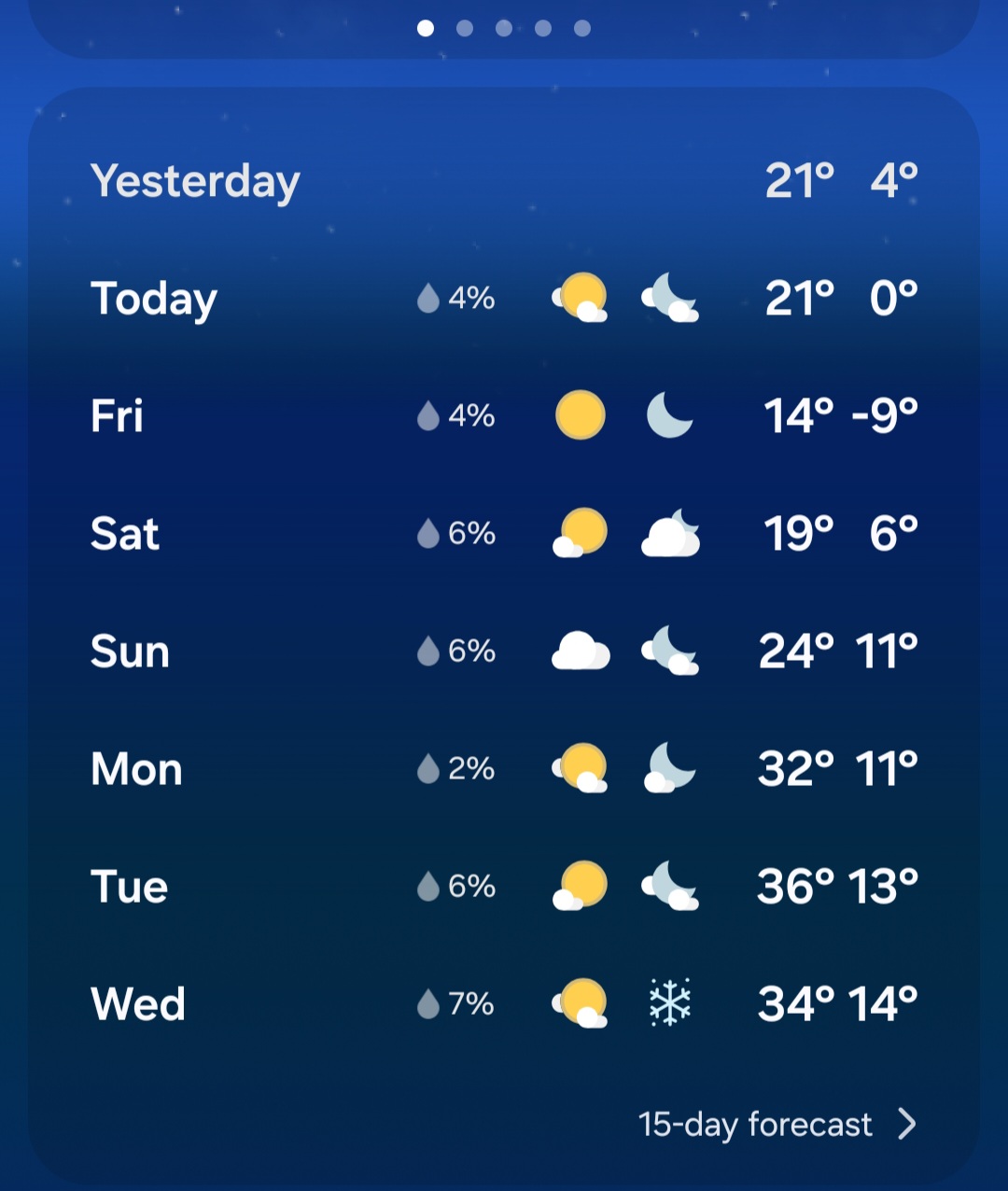 Friday is suppose to be a bit on the partly sunny side but daytime temps still in the low teens and negative 6 again for a low. Weekend doesn't look any better. Seven day forecast says Monday and Tuesday temps in the low to mid 20's. So damn tired of this weather 🤬