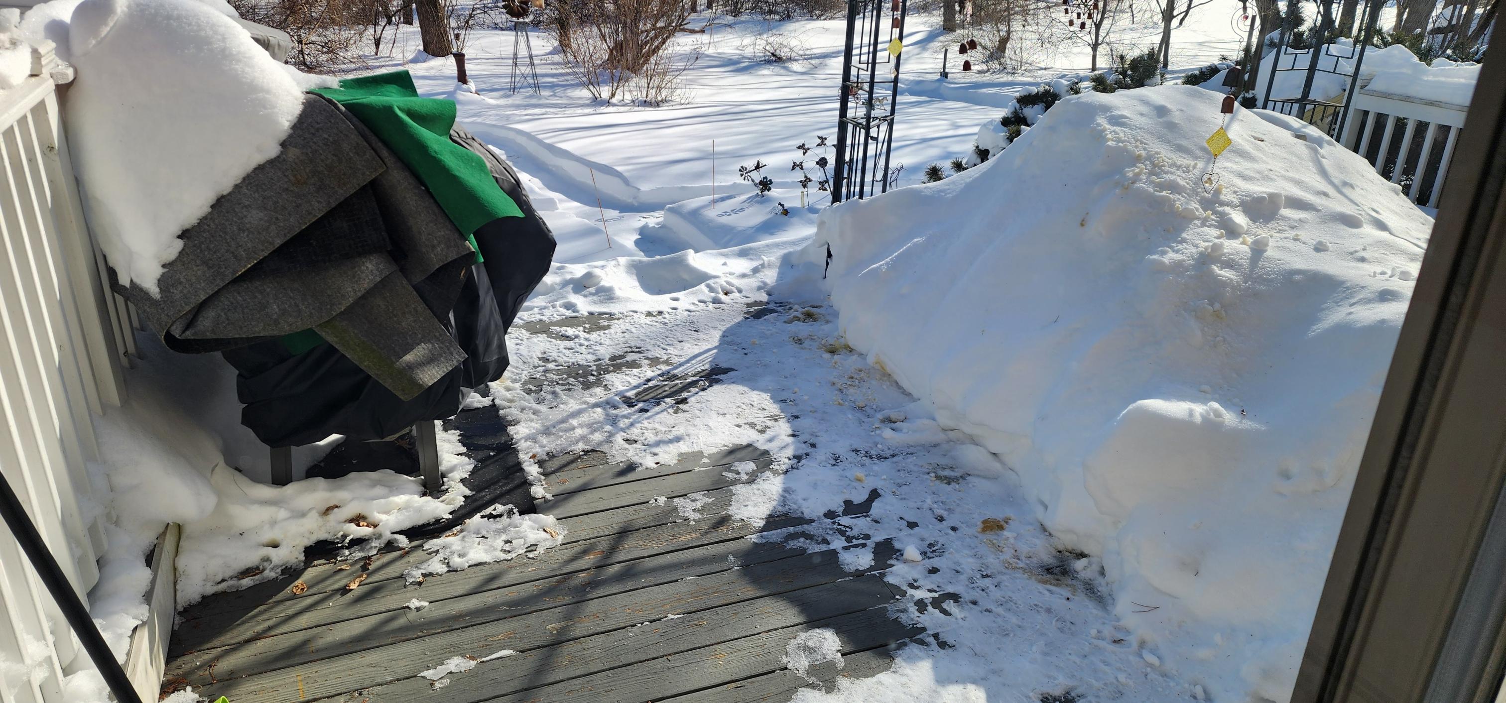 Notice in the background my snow blower "dog path" around the house... Ripley ( bischon/shitzu mix) ain't having anything to do with it.. Open the slider.. he goes onto the deck.. does his business and back in he comes. Too freaking cold..