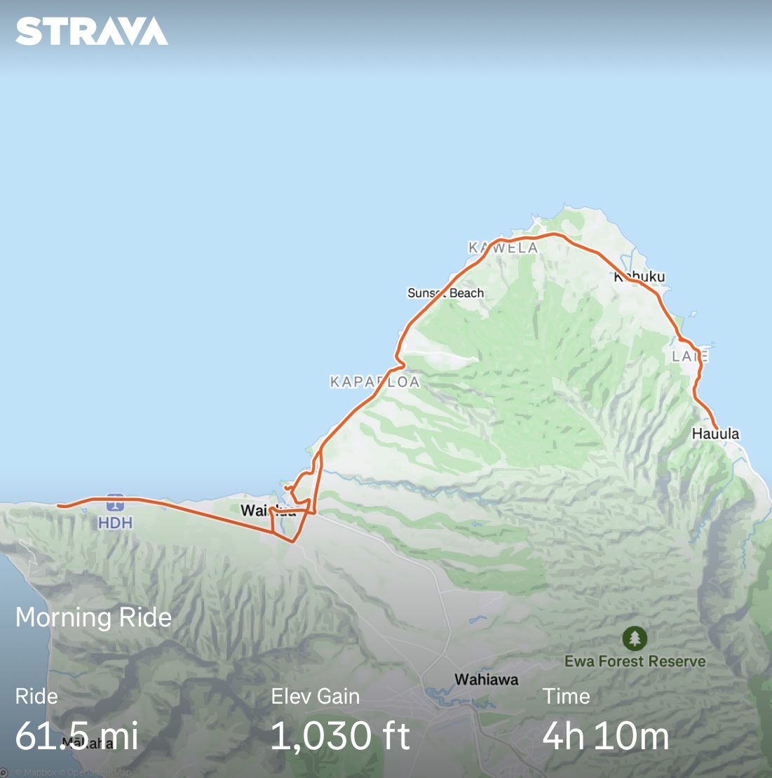 30 miles, good ride. 128HR for 2hr 50min, 74rpm cadence.