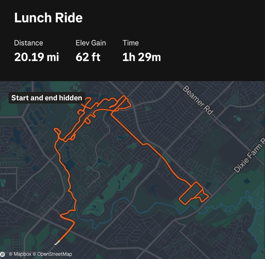 In summary, good ride. A few miles included my standard bike/run/walk trail and I realized how much I enjoy it, compared with sidewalks and paths alongside busy roads. |