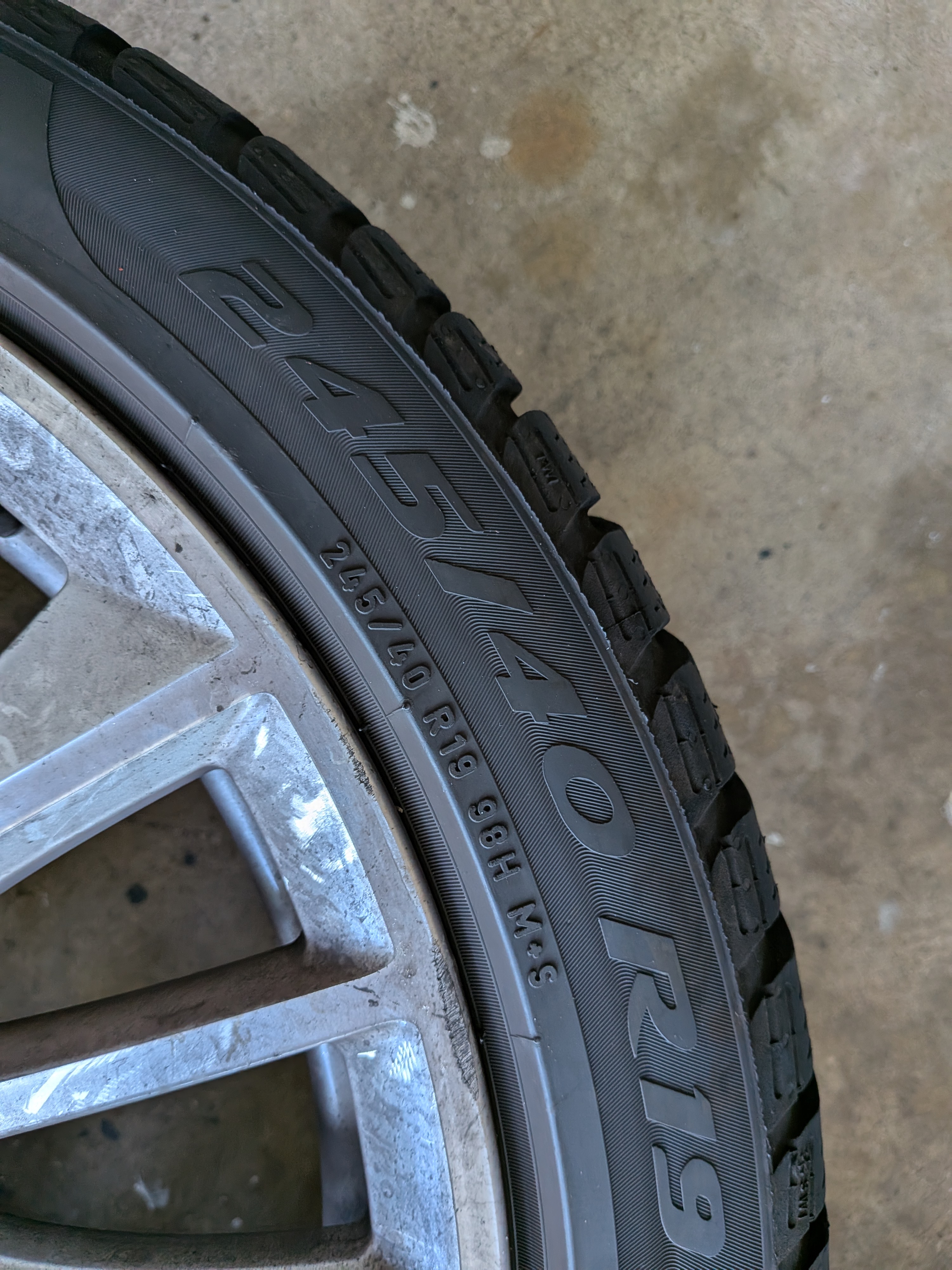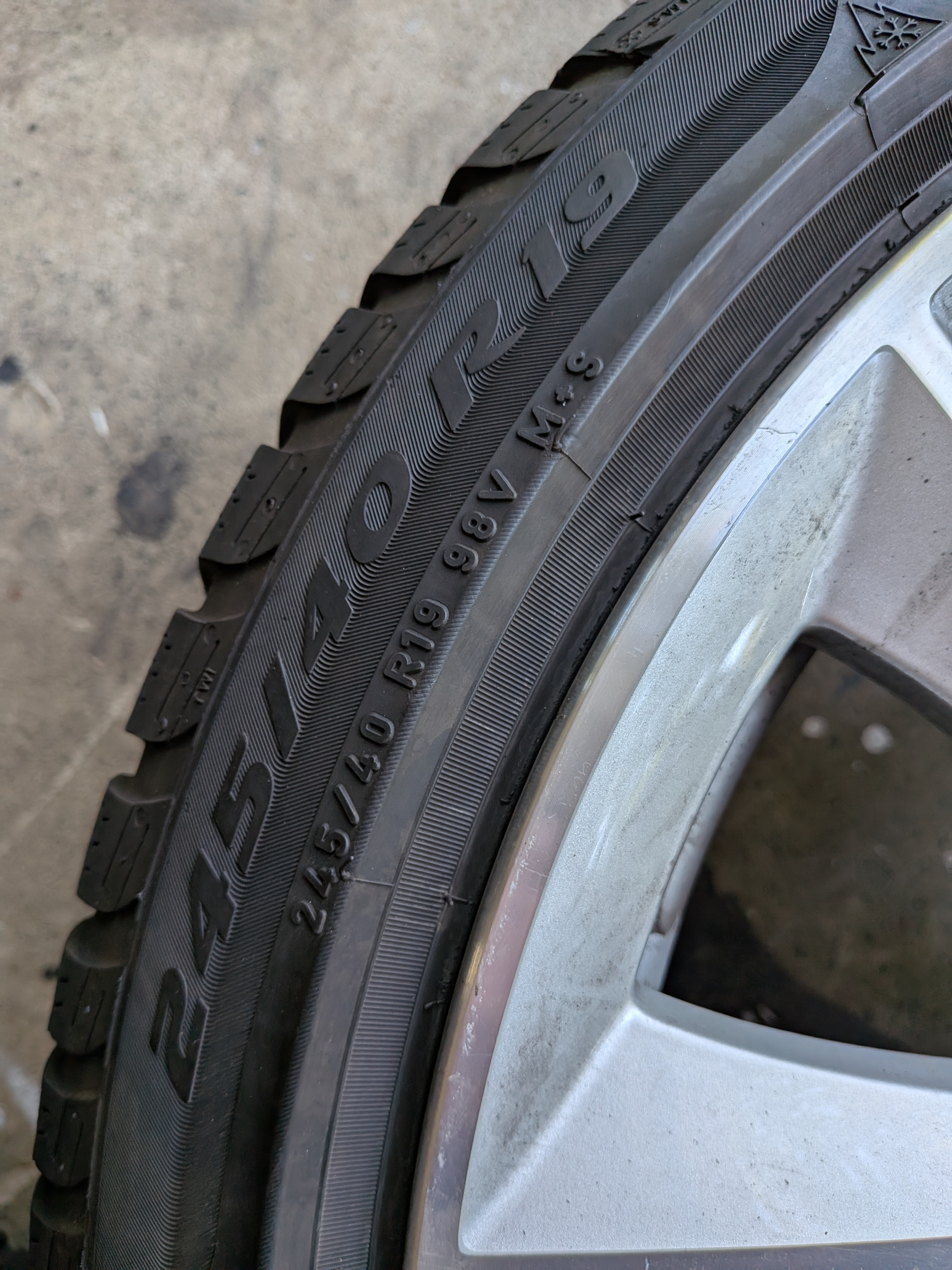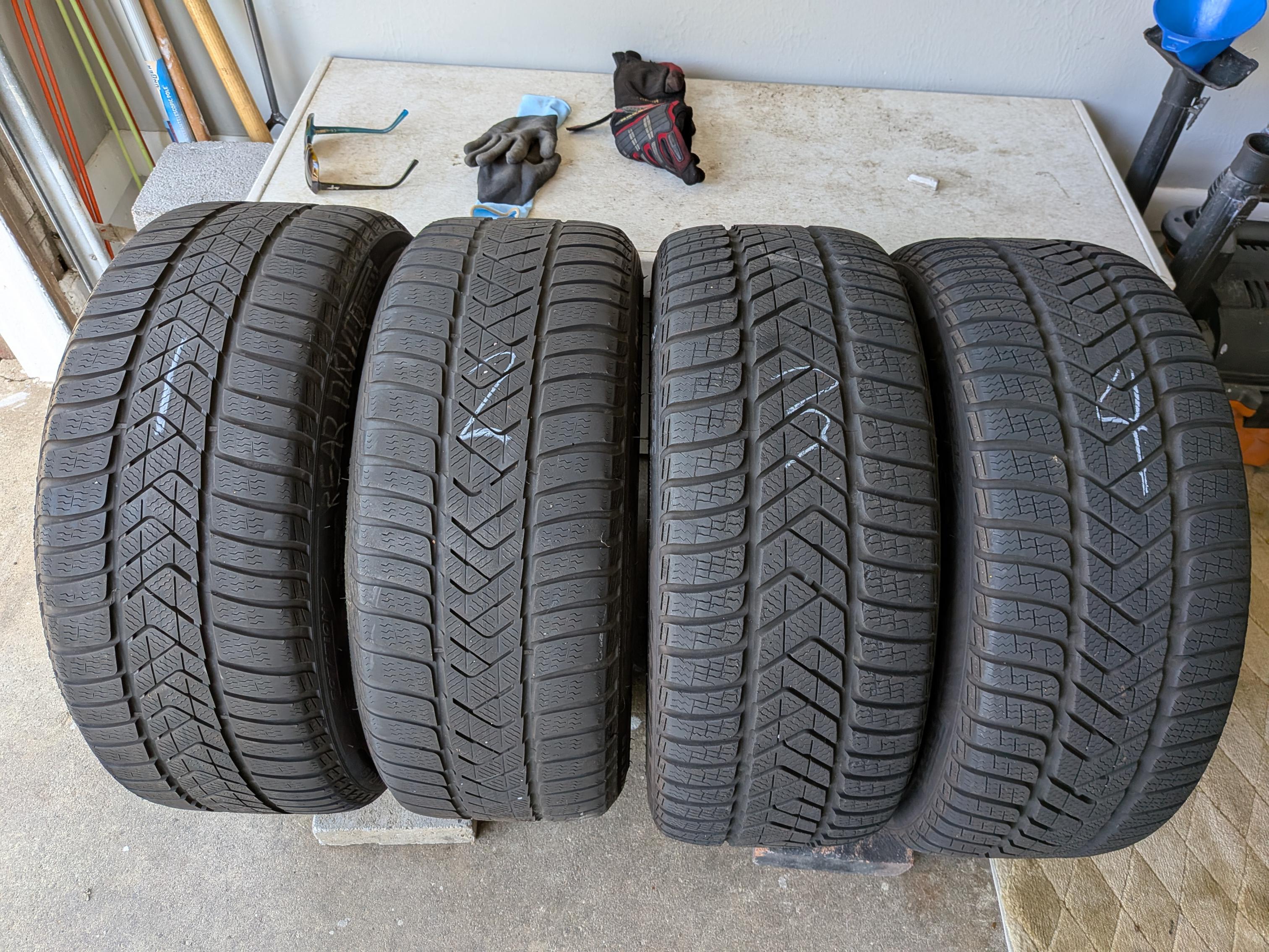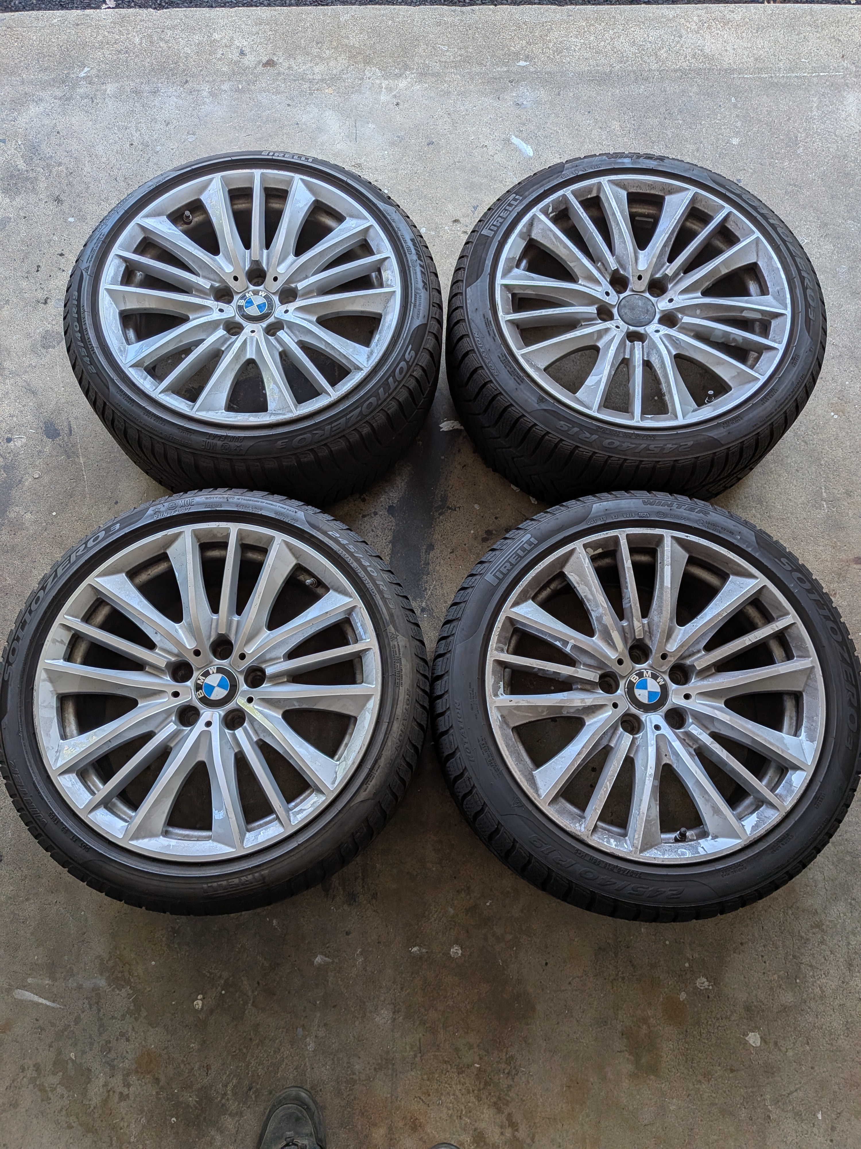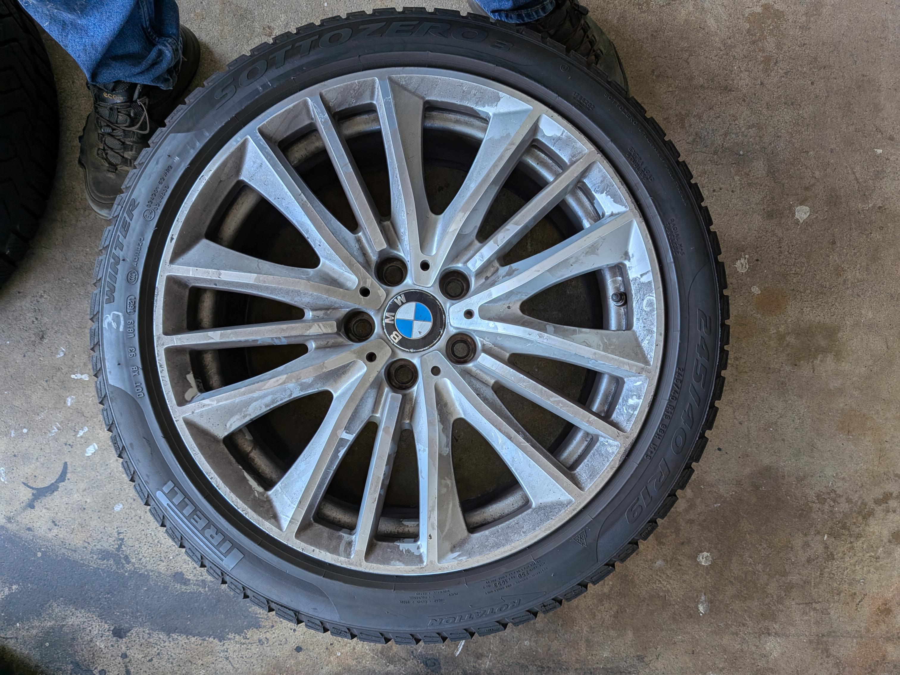 The is a set of BMW 19" rims mounted with Pirelli snow tires and TPMS. Rims came off a 7-series, not sure which year, but are in good shape with minimal rash. (A little brake-dusty from sitting in garage.) Take note that the rubber has two run-flats and two regulars, all matching Pirelli Sottozero3 245/40-R19. Why? Put the run flats in back, and soften up the ride by having regulars in front. The tires are numbered in the pics, and the tread depths are: RunFlat#1 5/32; RunFlat#2 4/32; Regular#3 7/32; Regular#4 7/32. The rims have the following writing/numbers on the inside of the spokes: RONAL; BMW; 6791384; POLAND; (Circled 1) 2804; 9JX19EH2+; IS44>AISI7<; 3 makers circles; blank; calendar code with 10, five bars, 7 dots. Hopefully these will match the style of rims you're looking for. The TPMS were mounted November of 2022. Not sure of the offset, but my F10 5-series needed 10mm spacer rings to clear the front calipers. If you want them, please add $40 to your offer. Located near Dulles Airport IAD in Northern Virginia. Local pickup; or I can deliver from Baltimore to DC to Fredericksburg for gas money; or if you make arrangements for a shipper to come to my house I'll help get them loaded. |